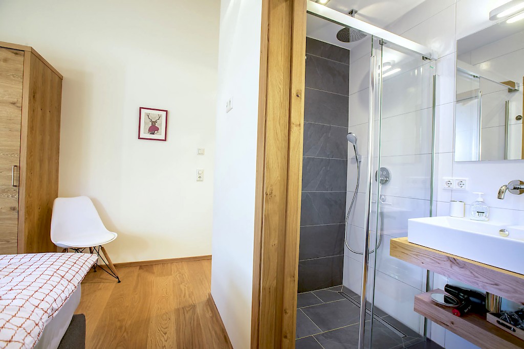 - Slaapkamer met uitzicht op de bergen en een 2-persoons boxspring, eigen badkamer met regendouche, wastafel en toilet.